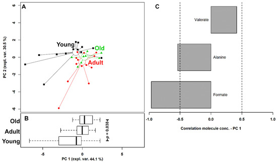 Three PCs were accepted by the algorithm to depict the overall data features. PC 1, accounting for 44.1% of the variance thus represented, summarized effectively the peculiarities connected to age (p < 0.05), with Young, Adult, and Old individuals appearing respectively at low, intermediate, and high PC scores. Among these molecules, formate and alanine were more abundant in young individuals, while valerate showed an opposite trend.