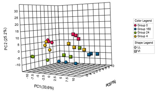 Classification of pig LL and VI muscle samples of different postmortem aging period by PCA. Pig LL and VI muscles were aged during 0, 4, 24, 168 h postmortem.