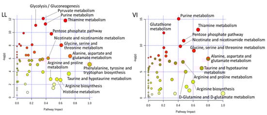Metabolic pathway impact analysis of pig LL and VI muscles during postmortem aging. Pathway impact values (horizontal axis) were calculated from the pathway topology analysis in MetaboAnalyst. A pathway with small p value and high impact is plotted as a red and large circle.