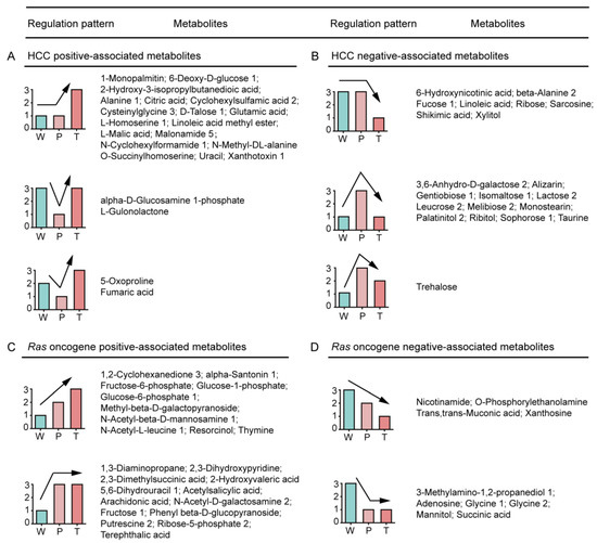 We categorized the altered metabolites into four groups, i.e., positively or negatively associated metabolites of HCC and RAS, to demonstrate their variation tendencies in Ras oncogene-induced hepatic tumorigenesis (Figure 1).