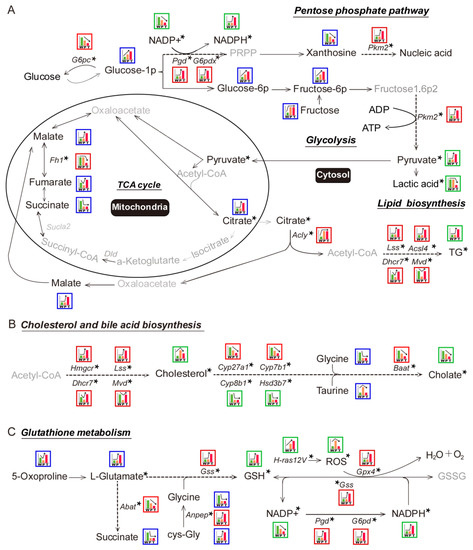 Schematic representation of the metabolic pathways in hepatocarcinogenesis. An exhaustive analysis of the integrated metabolomic and transcriptomic data identified multiple relevant metabolic pathways for further validation and investigation. (A) Metabolic pathways associated with glycolysis, tricarboxylic acid (TCA) cycle, pentose phosphate pathway (PPP), and lipid biosynthesis. (B) Metabolic pathways associated with cholesterol and bile acid synthesis. (C) Metabolic pathways associated with glutathione. The blue- and red-bordered boxes depict the expression-patterns of metabolomics and transcriptomics data, respectively. The green bordered boxes indicate the expression-patterns of metabolites that were detected directly. The relative expression levels of W (green histogram bar), P (orange histogram bar), and T (red histogram bar) are demonstrated in boxes; the different height of histogram bars indicate expression levels. The asterisk in the upper right corner of DEGs or DEMs indicates that these metabolites or enzymes were validated (detailed information is given in Figure 3 and Figure 4). Grey word represents the undetected metabolites in the present study. TG: triglyceride; NADPH: nicotinamide adenine dinucleotide phosphate; GSH: glutathione; ROS: reactive oxygen species. Other abbreviations are the same, as mentioned in Figure 1.