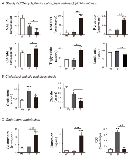 In P, the decreased level of fumarate and succinate indicated the blocked TCA cycle as compared to W. The pyruvate, citrate, and malate levels were not altered between W and P, which indicated that TCA cycle-related citrate malate shuttle was not significantly affected. In T, the decreased level of succinate as compared to W indicated the blocked TCA cycle. Intriguingly, the notably escalated levels of pyruvate, citrate, and malate demonstrated the enhanced TCA cycle-related citrate malate shuttle in T than W and P (Figure 2A, Figure 3A, Figure 4A, respectively; Figure S7; Table 1 and Table 2; Tables S6 and S8). Additionally, as the mitochondrial carrier SLC25A1 is the specific mitochondrial transporter of citrate/malate, we further verified its mRNA levels in W, P, and T. Consistent to the next-generation sequencing (NGS) data, there was no significant change for the mRNA levels of SLC25A1 among W, P, and T (data not shown). It might indicate that the expression level of SLC25A1 was sufficient to support citrate/malate transport and had not been specially regulated in the present experimental system.