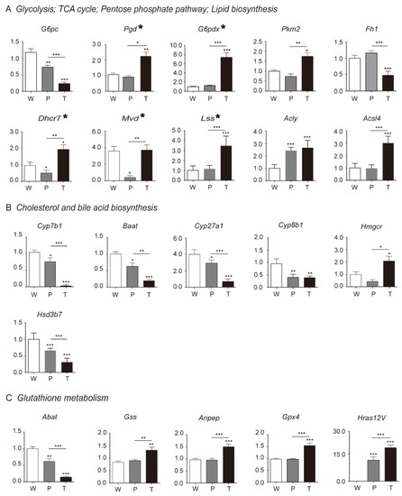 We observed a significant down-regulation of Cyp27a1, Cyp7b1, cyp8b1, Hsd3b7, and Baat in P along with the decreased level of cholate and glycine. It resulted in the cholesterol accumulation as compared to the W. The expression levels of HMGCR, Lss, Dhcr7, and Mvd, which coded for cholesterol biosynthetic enzymes, were either unaltered or decreased. It indicated the insignificant contribution of the cholesterol synthesis in the cholesterol accumulation in P. In case of T, we observed the overexpression of genes, which coded for cholesterol biosynthetic enzymes, i.e., Hmgcr, Lss, Dhcr7, Mvd, and the down-regulation of genes, which coded for bile acid synthesis enzymes, i.e., Cyp8b1, Hsd3b7, Cyp27a1, Cyp7b1, Baat, as compared to P or W. Additionally, due to the insufficient supply of glycine and taurine, the content of cholate was diminished in T as compared to P. Besides, the content of cholesterol was significantly higher in T than W but lower than P. It indicated that hepatoma cells had alternate mechanisms for cholesterol level reduction (Figure 2B, Figure 3B, Figure 4B, respectively; Figure S7; Table 1 and Table 2; Tables S6 and S8).