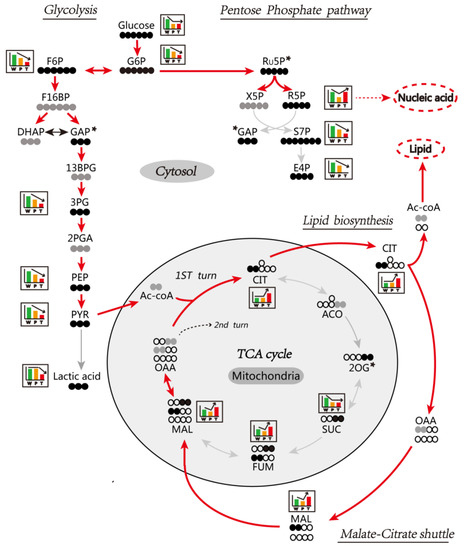 Schematic representation of [U-13C] glucose metabolic flux in the liver. The metabolic flux of [U-13C] glucose in the glycolysis, the pentose phosphate pathway, and the tricarboxylic acid (TCA) cycle is demonstrated. The solid and hollow black circles represent the 13C and 12C, respectively. The solid gray circles represent the 13C in undetected metabolites. The boxes with histograms represent the expression-patterns among W, P, and T (significant changes at least twice in pairwise comparison). The asterisks represent metabolites with no change or only a single significant change in a pairwise comparison. The histogram bar represents the relative expression levels of W (green histogram), P (orange histogram), and T (red histogram), and the bar’s height indicates a significant change in expression levels. G6P: glucose 6-phosphate; F6P: fructose 6-phosphate; F16BP: fructose-1,6-bisphosphate; DHAP: dihydroxyacetone phosphate; GAP: glyceraldehyde 3-phosphate; 13BPG: 1,3-bisphosphoglycerate; 3PG: 3-phosphoglycerate; 2PGA: 2-phosphoglycerate; PEP: phosphoenolpyruvate; PYR: pyruvate; Ac-CoA: acetyl CoA; CIT: citrate; ACO: aconitate; 2OG: 2-oxoglutarate; SUC: succinate; FUM: fumarate; MAL: malate; OAA: oxaloacetate; Ru5P: ribulose-5-phosphate; X5P: xylulose-5-phosphate; R5P: ribose-5-phosphate; S7P: sedoheptulose-7-phosphate; E4P: erythrose-4-phosphate. Other abbreviations are the same, as mentioned in Figure 1.
