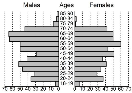 Of the 1011 enrolled individuals, 526 (52%) were male, and compared to the general population older age groups were overrepresented (Figure 1). All the participants reported at least one medical problem that could be associated with an ICD-10 [19] diagnostic code (incl. O-Z codes). After the removal of diagnoses of F (somatoform or anxiety) and O-Z codes, as well as myopia, dental caries and dental anomalies, 36 (M/F = 26/10) patients with a mean age of 36.1 (23–68) years were found to have no diagnoses. This group is referred to as “healthy controls”. In total, 105 ICD-10 categories (excluding categories differing in specification details) remained, 65 of which were found in more than 50 cases. The most frequent diagnoses or diagnosis groups with their age and gender proportions are shown in Table 1.