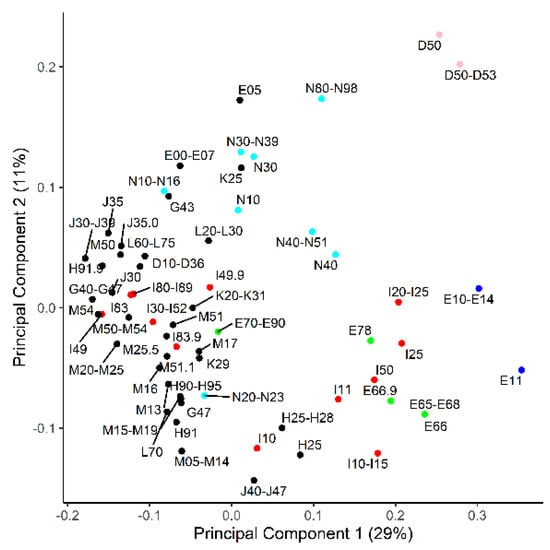 Principal component analysis on how ICD-10 codes relate to each other based on area under the curve of receiver operator characteristics (AUC-ROC) values from a set of 49 metabolites. Components 1 and 2 are the shown on the x- and y axes, respectively, and explain the denoted percentage of total variance. Red—diseases of the circulatory system; blue—diabetes; green—obesity and dyslipidemia; pink—anemia; cyan—diseases of the genitourinary system.