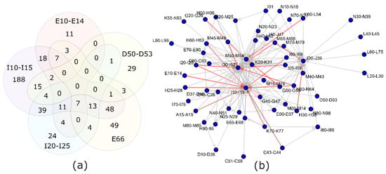 Overlap between diagnosis groups. (a) Relations between the 5 diagnosis groups separated from the bulk of diagnoses by principal component analysis: E66—obesity; D50–D53—anemia; E10–E14—diabetes; I10–I15—hypertension; I20–I25—ischemic heart diseases. (b) A more comprehensive view of the comorbidities among the study population. Gray arrows—40–60% of people with the diagnosis at the beginning of the arrow have also the diagnosis at the end of the arrow. Red arrows—over 60% overlap for the diagnoses.