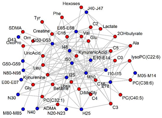 Finally, ICD-10 codes with a particular metabolite as a potential marker were pooled, and whether the AUC-ROC remained significantly above 0.5 was tested. The highest AUC-ROC values for combined diagnoses were between 0.7 and 0.8 and pooling more than two or three diagnoses led to a decrease in the AUC-ROC. The results of pairwise pooling were presented as a network of diagnosis codes for a particular metabolic marker candidate (Leu+Ile is given in Figure 5 and other metabolites are given in Figure S1). In most cases, two separate clusters, connected by relatively fewer lines than within the clusters, appeared. For 2-hydroxybutyrate, Ala, C4, C16 and C18 acylcarnitines and other lipid species, the second cluster was minimal in size and for Val, Leu+Ile, Gly, uric acid, betaine and SDMA, the two clusters were roughly equal.