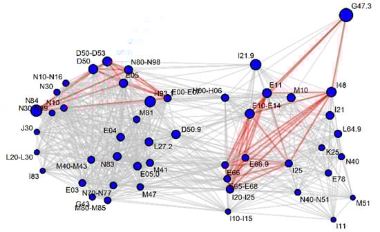 The connecting diseases which maintained a significant AUC-ROC with either cluster were most frequently: hypertension (I10–I15), dorsopathies (M50–M54), ischemic heart diseases (I20–I25) and obesity (E65–E68). Figure 3 demonstrates that hypertension and back pain diagnoses together with chronic upper respiratory track complaints and I30–I52 (other heart diseases, including atrial fibrillation) are common comorbidities for many diseases. Therefore, the relation may remain significant, because the people behind both diagnoses are largely the same individuals.
