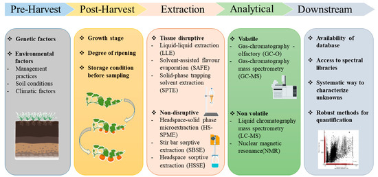 To harness the potential of metabolomics for evaluating flavor-associated metabolites in PBPs, it is important to keep in mind that both pre and post-harvest procedures including the extraction and analysis of metabolites will have great bearing on the observed results (Figure 1). In order to complement the existing sensory-based and instrumental measurements, a clear interface and seamless integration has to be established between the pre and post-harvest procedure in order to s to ensure aa smooth workflow for rapid quality assessment of fresh PBPs (Figure 2).