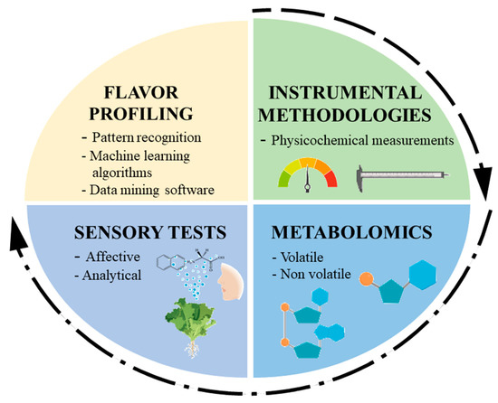 Within the agri-food sector, several diverse areas utilize metabolomics approaches for a variety of applications, as discussed in the previous Section 3.1. One such application involves evaluating the flavor-associated metabolites in fresh PBPs, which are determined by their biochemical composition. As stated in earlier Section 3.1, flavor has the largest influence on consumer behavior and consumption pattern [15], and consequently, most of the research efforts in this domain are catered towards determining the flavor-related metabolites in PBPs. Perception of flavor involves both volatile aroma metabolites as well as non-volatile taste metabolites which belong to different classes.