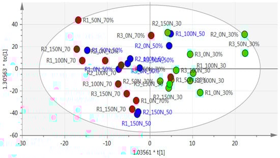 An unsupervised principal component analysis (PCA) showed no separation between treatments, and therefore, a supervised orthogonal partial least square discriminatory analysis (OPLS-DA) model was used to analyze the data, which separated the well-watered treatment (30% ADL) from the two water-stressed treatments (50% and 70% ADL), forming two groups (Figure 2). Data points of the severely stressed treatment (70% ADL) were generally clustered to the left (brown circle), with the moderately stressed treatment (50% ADL) (blue circle) more to the centre, indicating a gradual change from the well-watered treatment (30% ADL) on the right (green circle) to the severely stressed treatments on the left. The OPLS-DA statistical model showed goodness-of-fit (R2X = 0.766) with a lower predictability as the clusters were not clearly separated (Q2 = 0.101).