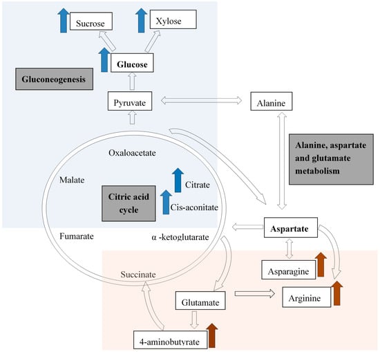 The well-watered treatment (30% ADL) showed an increase in primary metabolites, especially the sugars linked to gluconeogenesis and the citrate cycle (Figure 3). Cis-aconitate is an intermediate in the citrate cycle and this explains the accumulation of citric acid in the well-watered treatment. As for the water-stressed treatments (50% and 70% ADL), the amino acids asparagine and arginine, as well as 4-aminobutyric acid increases, are all linked to the alanine, aspartate, and glutamate metabolism (Figure 3).