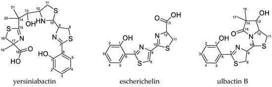 Ybt is much discussed in relation to UTIs. This metallophore got its name from Yersinia pestis, which also belongs to the Enterobacteriaceae. The high pathogenicity island (HPI), which encodes the proteins required for the biosynthetic pathway as well as the regulation and transport of Ybt, has been found in various species of the family of Enterobacteriaceae [,,]. Besides its property as a chelating agent for Fe(III), Ybt also shows the ability to complex additional metal ions, for example, Ga(III), Al(III), Ni(II), Co(III), and Cr(III). The complexation with Cu(II) was observed during UTI as well and confers a protective effect of the bacteria against copper intoxication [,,,]. The biosynthetic pathway of Ybt was described in vitro by Miller et al. []. However, not many intermediates of the biosynthetic pathway have been analyzed yet. One example is escherichelin (Figure 1), which has recently been identified and detected during UTI caused by E. coli. It was previously known as HPTT-COOH (hydroxyphenyl-thiazolyl-thiazolinyl-carboxylic acid) and described as a synthetic inhibitor of pyochelin, a siderophore from Pseudomonas aeruginosa, which is structurally similar to Ybt [,,,,,,]. Other structurally diverse Ybt derivatives can be produced by different bacterial strains []. Ulbactin B (Figure 1), which is one of several different ulbactins, is a derivative isolated from marine bacteria [] and has not yet been described in E. coli.