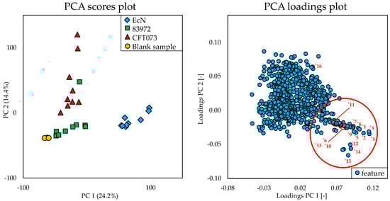 The principal component analysis (PCA) scores plot and the corresponding PCA loadings plot of the multivariate statistical analysis of the metabolome of the Escherichia coli (E. coli) strains EcN, 83972, and CFT073 cultivated in minimum essential medium (MEM) for 6 h and the blank sample treated under the same conditions. Three biological replicates of each strain were analyzed in triplicate. The labeled numbers of the red marked area correspond to the features of Table 1.