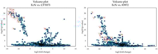 The volcano plots of the univariate statistical analysis of the metabolome of the E. coli strains EcN vs. CFT073 and EcN vs. 83972 cultivated in MEM for 6 h. Three biological replicates of each strain were analyzed in triplicate. The labeled numbers of the features correspond to the features of Table 1.