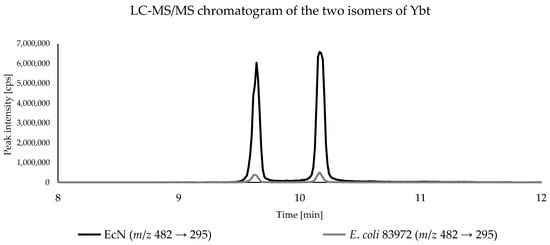 LC-MS/MS chromatogram of the culture supernatant of E. coli strains EcN and 83972, displaying the two isomers of Ybt with the mass spectrometric transition m/z 482→ 295.