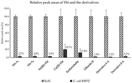 The comparison of the relative peak areas corresponding to the metabolites of interest is shown in Figure 5. The E. coli strain 83972 showed a relative peak area of 2.7% for the first Ybt isomer and 2.8% for the second isomer compared to EcN. Fe(III)-Ybt exhibited a relative peak area of 2.9%, which is comparable with the relative peak areas of the two isomers of Ybt. Cu(II)-Ybt, on the other hand, showed a higher relative peak area of 19.7%. The chromatograms of the culture supernatant from E. coli strains EcN and 83972, displaying the two metal complexes of Ybt, are shown in the Supplementary Material in Figure S4.