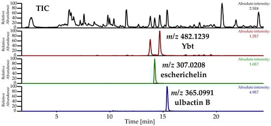 In this study, the metabolites escherichelin and ulbactin B, known derivatives of Ybt, were detected as discriminating features comparing the metabolome of E. coli strains EcN, 83972, and CFT073. The total ion chromatogram (TIC) and the EIC of the pre-concentrated culture supernatant of EcN, displaying escherichelin and ulbactin B next to Ybt, which was obtained during the isolation of ulbactin B, are shown in Figure 6.