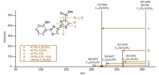 MS2 spectrum of escherichelin ([M+H]+: C13H11N2O3S2+, calculated: m/z 307.0206, measured: m/z 307.0208, Δm 0.8 ppm). It corresponds to that in literature [], which also described the same NL of 87 (fragment a), 46 (fragment b), 78 (fragment d), and 104 Da (fragment e). Additionally, under this condition of the fragmentation experiment, the NL of 44 Da (fragment c) was detected as well.