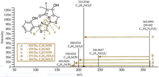MS2 spectrum of ulbactin B ([M+H]+: C17H21N2O3S2+, calculated: m/z 365.0988, measured: m/z 365.0991, Δm −0.8 ppm). It shows an NL of 153 (fragment a), 119 (fragment b), 165 (fragment c), 175 (fragment d), and 183 Da (fragment e), which correspond to the proposed fragments.
