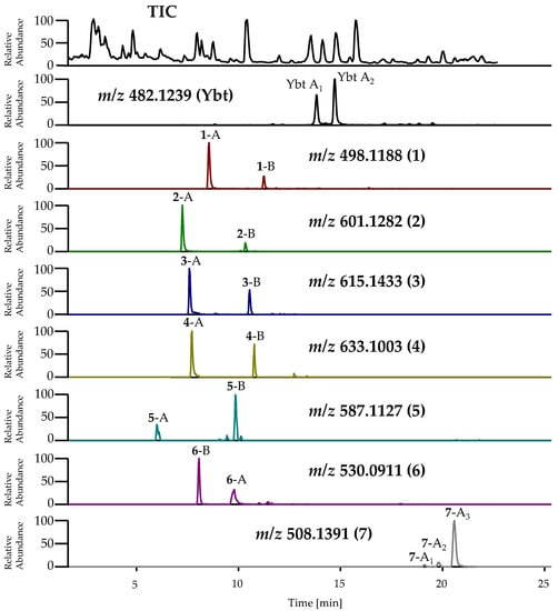TIC and EIC of Ybt and its novel derivatives in the pre-concentrated supernatant of cultures of EcN from the isolation of ulbactin B. Analysis was carried out by LC-HRMS. The abbreviations for these metabolites are summarized in Table S3 in the Supplementary Material. Ybt ([M+H]+: C21H28N3O4S3+, calculated: m/z 482.1236, measured: m/z 482.1239, Δm 0.5 ppm), 1 ([M+H]+: C21H28N3O5S3+, calculated: m/z 498.1186, measured: m/z 498.1188, Δm 0.5 ppm), 2 ([M+H]+: C24H33N4O6S4+, calculated: m/z 601.1277, measured: m/z 601.1282, Δm 0.8 ppm), 3 ([M+H]+: C25H35N4O6S4+, calculated: m/z 615.1434, measured: m/z 615.1433, Δm −0.2 ppm), 4 ([M+H]+: C24H33N4O6S5+, calculated: m/z 633.0998, measured: m/z 633.1003, Δm −0.8 ppm), 5 ([M+H]+: C23H31N4O6S4+, calculated: m/z 587.1121, measured: m/z 587.1127, Δm 1.0 ppm), 6 ([M+H]+: C21H28N3O5S4+, calculated: m/z 530.0906, measured: m/z 530.0911, Δm 0.9 ppm), 7 ([M+H]+: C23H30N3O4S3+, calculated: m/z 508.1393, measured: m/z 508.1391, Δm −0.4 ppm).