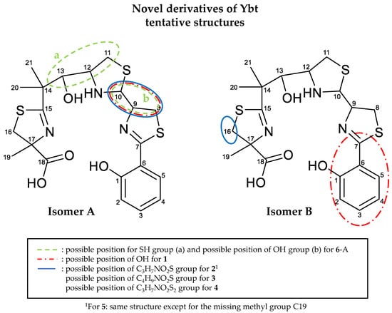 The derivatives 2-A as well as 5-A are suspected to contain a cysteine group as side chain, since an NL of 121 Da (C3H7NO2S) (Table 6) was observed for both. Due to a further NL of 87 Da (C3H5NO2, the corresponding fragment with the m/z 327.0290 for the [M-187-87+H]+ or [M-173-87+H]+ ion, C13H15N2O2S3+, Supplementary Material), which corresponds to the molecular formula of cysteine without H2S, it is assumed that the bond between the carbon and sulfur atom of the assumed cysteine side chain is cleaved. This would imply that the cysteine group is linked to the Ybt core structure via the sulfur atom. However, this assumption cannot be conclusively proven based on the fragmentation spectra. A different interpretation of the spectra is possible with the NL of 87 Da potentially caused by the loss of an alanine group, and the whole modification of the molecule, thus consisting of an additional alanine as well as an SH group.