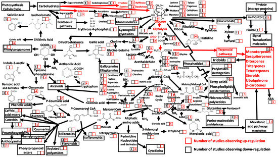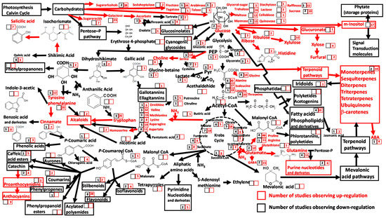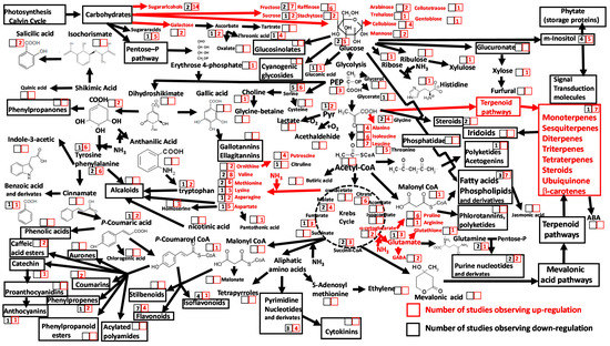 Shifts in principal plant metabolites and metabolic pathways in response to increased atmospheric CO2 concentrations reported in 17 ecometabolomic studies. The numbers within the squares are the numbers of reports describing changes in photosynthetic tissue metabolite concentration and/or pathway activity under elevated atmospheric CO2 concentrations. Red numbers within red squares indicate significant increases; black numbers within black squares indicate significant decreases. Red arrows indicate upregulation of the metabolic pathway.