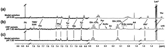 Partial one-dimensional 1H NMR spectra of the model solution (a,c) and an authentic CSF sample (b). The impact of a rise in pH can be clearly seen following the resonance positions of His, Phe, Tyr, Gln, Ala and Thr. TMX/XAN = xanthine/caffeine (tentative assignments, see Supplementary Materials for discussion), Ala† = Alanine + unknown, * = lactate 13C satellite, Lac‡ = lactate + Thr, unk = unknown. Note: For compound abbreviations see Table 2.