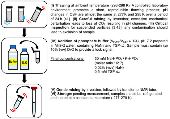 NMR spectroscopic analysis of CSF in the field of metabolomics has gained importance due to the minimal requirement for sample preparation, and its ability to simultaneously detect and quantify a wide range of compounds. A fairly simple composition, low lipid and protein content [9,10,11]—compared to biofluids like blood or urine—make CSF an ideal candidate for NMR analysis, and indeed, its feasibility was demonstrated some thirty years ago [12]. Yet, handling of CSF samples still remains challenging [13] and some practical issues related to sampling procedure and sample stability, particularly pH control [14], require special attention.