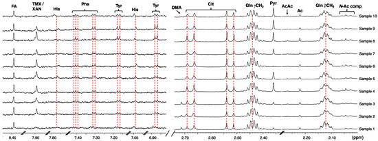 We carried out an NMR study on a small cohort of CSF samples (n = 23) and observed an excellent buffer performance, with a reproducible effect on chemical shift/peak shape. The measured pH after addition of buffer was 7.52 ± 0.16 (range = 7.36–7.68). Excerpts of 1H NMR spectra of ten representative CSF samples are shown in Figure 3 demonstrating excellent alignment of chemical shifts of metabolites known to be (strongly) dependent on sample pH. Leveling alterations in the ionization equilibria of metabolites induced by pH and salinity leads to the observed chemical shift consistency of metabolite peaks. Following data acquisition, we monitored the pH of several samples (stored at 277 K) over three days and did not observe significant pH changes.