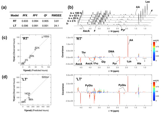 Model complexity was optimized by leave-one-out cross-validation, and both models were computed with one PLS component only. The performance and quality parameters of the PLS models are presented in Figure 4a. The proportion of variance in the spectral data explained (indicating goodness of fit) by each model was about 60%, R2X = 0.633 (‘RT’) and 0.596 (‘LT’), and close to 100% for the response variable, R2Y = 0.994 (‘RT’) and 0.991 (‘LT’). Each model’s predicted variation Q2 (i.e., goodness of predictability) was high, 0.905 in the ‘RT’, and 0.931 in the ‘LT’ model. The cross-validated predictions Y(pred) versus measured Y-variables Y(var) for each model, ‘RT’ and ‘LT’ respectively, with root-mean-square errors of estimation (RMSEE) of 3.81 and 24.1 are shown on the left in Figure 4c,d; respectively and the diagonal in each plot represents the target line.