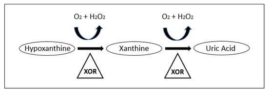 Uric acid is a free radical scavenger that can protect DNA in the event of damage. The metabolite is a product of purine metabolism in which xanthine oxidoreductase (XOR) breaks down hypoxanthine and xanthine. The oxidation is thought to result in the clearing of free oxygen radicals and the formation of uric acid [,,]. A simple purine metabolism pathway is shown in Figure 1. Xanthine and hypoxanthine were also found to be increased in several studies as shown in Table 1, indicating that increases in the purine metabolism pathway may be ubiquitous.