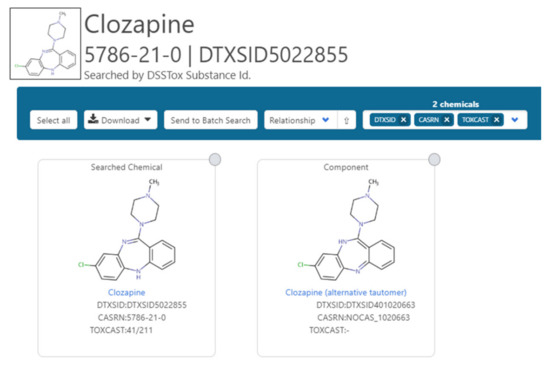 - Williams, A.J.; Grulke, C.M.; Edwards, J.; McEachran, A.D.; Mansouri, K.; Baker, N.C.; Patlewicz, G.; Shah, I.; Wambaugh, J.; Judson, R.S.; et al. The comptox chemistry dashboard: A community data resource for environmental chemistry. J. Cheminform. 2017, 9, 61. [Google Scholar] [CrossRef] [PubMed]