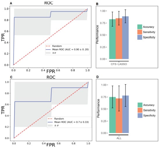 Given that every feature selection algorithm adopts a different approach and a subjective function, which may change priorities, it is not unusual to observe disagreements in the resulting features and their order of importance. In our case, of the top six metabolites, five of them were found to be the same, with order differences by two feature selection algorithms, which may be considered as a consensus. Then, we carried out our modeling with the common set of metabolites, which both CFS and LASSO methods agreed on, i.e., AMP, O-Acetylcholine, l-Fucose, Isobutyric acid, and Glycerol. We built SVM and LR models, which were evaluated through 10-fold CV again to test their capacity for a better or equivalent diagnostic accuracy. Our experiments with this narrowed set of features gave a better average diagnostic accuracy (0.83 vs. 0.78 and 0.75 vs. 0.80). Similarly, we observed a better performance in terms of AUC (0.90 vs. 0.77 and 0.79 vs. 0.70), sensitivity (0.85 vs. 0.67 and 0.87 vs. 0.80), and specificity (0.89 vs. 0.65 and 0.73 vs. 0.67) for the smaller set of features, which might be the most representative metabolites amongst others. While higher sensitivity and specificity values indicated more accurate decisions for both epileptic and non-epileptic groups, lower standard deviations also suggested consistent predictions over different training and testing groups with the same set of features. In a recent study, Wu et al. (2016) investigated metabolic and genomic signatures as potential non-invasive biomarkers for epilepsy [38]. In said study, a highly consistent predictive metabolite logistic regression model with reduced lactate and increased creatine plus phosphocreatine (Cr + PCr) and choline provided AUC, sensitivity specificity values of 0.88, 0.85 and 0.79, respectively. In our study, we go one step further; we profiled brain tissues from ENOS and produced powerful models with an AUC = 0.90, with sensitivity = 0.85 and specificity = 0.83 (Supplementary Figure S2). To the authors’ knowledge, these are the highest diagnostic values to be reported in the literature.