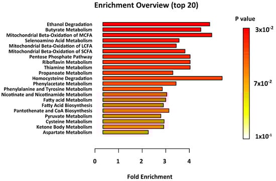 Metabolomics enrichment analysis highlighted thirteen metabolic pathways as significantly disturbed in epileptic brain, as compared with controls. These include; ethanol degradation, butyrate metabolism, mitochondrial beta-oxidation of medium-, long- and short-chain fatty acid (MCFAs, LCFAs, SCFAs) metabolism, and fatty acid biosynthesis (Figure 2, Supplementary Table S3).