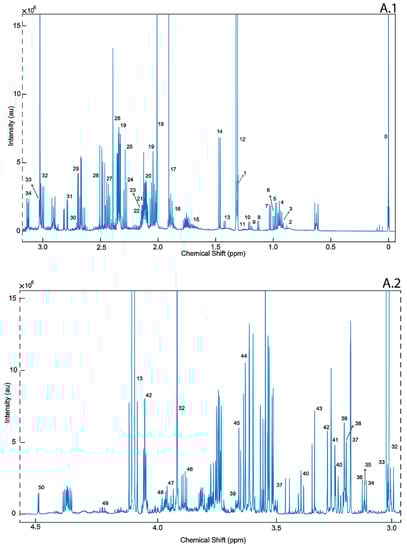 For 1H-NMR, 50 mg samples were extracted in 50% methanol/water (1 g/mL) in a sterile 2 mL Eppendorf tube. The samples were mixed for 20 min and sonicated for 20 min, and the protein was removed by centrifugation at 13,000× g at 4 °C for 30 min. Supernatants were collected, dried under vacuum using a Savant DNA Speedvac (Thermo Scientific, Waltham, MA, USA), and reconstituted in 285 μL of 50 mM potassium phosphate buffer (pH 7.0), 30 μL of Sodium 2,2-dimethyl-2-silapentane-5-sulfonate (DSS) and 35 μL of D2O. Then, 200 μL of the reconstituted sample was transferred to a 3 mm Bruker NMR tube for analysis. All samples were housed at 4 °C in a thermostatically controlled SampleJet autosampler (Bruker-Biospin, Billerica, MA, USA) and heated to room temperature over 3 min prior to analysis by NMR [65].