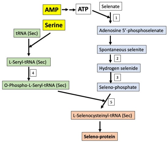 Seleno-protein synthesis in humans using organic or inorganic sources of selenium from the diet. Enzymes: 1-Sulfate adenylyltransferase; 2-NADPH (reduced nicotinamide adenine dinucleotide phosphate)-thioredoxin reductase; 3-Selenophosphate synthase; 4-O-phosphoseryl-tRNA(Sec) kinase; 5-l-selenocysteinyl-tRNA(Sec) synthase and O-phosphoseryl-tRNA: Selenocysteinyl-tRNA synthase.