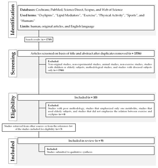 After searching the literature, 1749 documents were identified (Figure 1). Nine papers were included in the final analysis after excluding duplicates and studies that did not meet the inclusion criteria (Table 1). The main reasons for exclusion were the type of study participants (animal-based, children or elderly individuals, and those with a pathology) and the lack of focus on exercise–oxylipin effects.