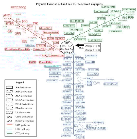 The free PUFAs are subsequently oxidized by COX, LOX, and CYP enzyme pathways that generate the oxylipins [,]. The magnitude of increase and the diversity of oxylipins generated by these pathways from omega-6 (ω-6) and omega-3 (ω-3) free PUFAs (AA, AdA, ALA, DGLA, DHA, EPA, and LA) appear to be greatest with prolonged and intensive aerobic exercise workloads (Table 3 and Figure 2). There is scant evidence regarding the physiological roles of oxylipins within an exercise context, but the literature, in general, suggests regulatory roles in inflammatory processes, immune responses, cardiovascular system and kidney function, tissue repair, mitochondrial function, and oxidative stress [,,,,,,,,].