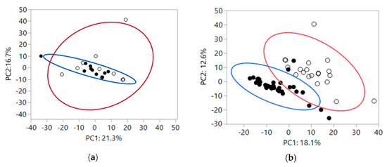 (a) At baseline fecal metabolites of healthy cats (closed circles) and chronic kidney disease (CKD) cats (open circles). Large colored circles represent 95% variance areas of healthy (blue) and CKD cats (red). The means of PC1 and PC2 were not significantly different (PC1, P = 0.25; PC2, P = 0.61). Variances were also not significantly different based on health status (PC1, P = 0.38; PC2, P = 0.10). (b) Fecal metabolites after feeding scFOS or apple pomace fiber sources for 4 weeks (closed circles) vs baseline (open circles). Large colored circles represent 95% variance areas at baseline (red) and after feeding fiber sources (blue). The means of PC1 and PC2 after feeding dietary fiber for four weeks were different (both P < 0.0001). Variances were not significantly different between baseline and after feeding fiber sources for 4 weeks (PC1, P = 0.75; PC2, P = 0.10).