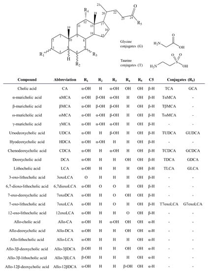 - Hofmann, A.F.; Hagey, L.R.; Krasowski, M.D. Bile salts of vertebrates: Structural variation and possible evolutionary significance. J. Lipid Res. 2010, 51, 226–246. [Google Scholar] [CrossRef]