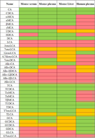 The method was then tested using different matrices from human and mouse (Figure 2). The list of bile acids included in the LC-MS/MS method for quantification is represented by three different colors, indicating the robust detection and quantification of the compound (green), presence at a low concentration around LOQ, or absence in few tested samples (yellow), and absence in most samples (red) (concentrations at Table S1). In contrast to humans, where glycine-conjugated bile acids are the major components of the bile acid pool with a ratio of glycine to taurine-conjugated bile acids of about 3:1 in adult males, taurine conjugates represent the most abundant bile acids in the mouse and rat [7]. All primary and secondary bile acids could be robustly quantified, with the exception of LCA and its conjugates. Some of the allo-bile acids and 7oxo bile acids were either present at low concentrations around LOQ or not detected. This is not unexpected, as these bile acids represent minor metabolites that are thought to be increased in certain enzyme deficiencies or diseases [23,44].