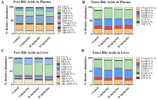 Bile acid composition analyzed in mouse plasma and liver tissue samples. Data represent relative abundances (%). The four groups correspond to control, and simvastatin exposure in mice at three different doses: 5, 10, and 25 mg/kg/day. (A,C) Profiles of free bile acids in plasma and liver tissue, respectively; (B,D) Taurine-conjugated bile acids in plasma and liver, respectively. n = 6 per group.