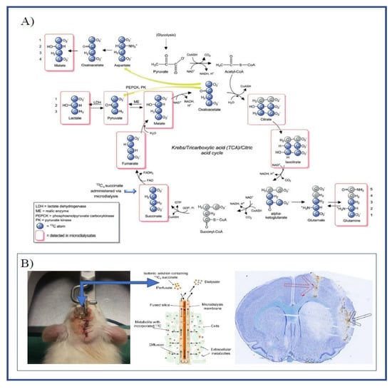 - Havelund, J.F.; Nygaard, K.; Nielsen, T.H.; Nordström, C.H.; Poulsen, F.R.; Færgeman, N.J.; Forsse, A.; Gramsbergen, J.B. In vivo microdialysis of endogenous and 13C-labeled TCA metabolites in rat brain: Reversible and persistent effects of mitochondrial inhibition and transient cerebral ischemia. Metabolites. 2019, 9, 204. [Google Scholar] [CrossRef]