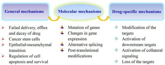Chemotherapy and targeted therapy are common methods of tumor treatment, but tumor cells can develop resistance to drugs, leading to the failure of treatment. The development of tumor drug resistance involves general mechanisms and drug-specific or pathway-specific mechanisms (Figure 1) [1,2,3]. Pathway-specific mechanisms require the restoration of the tumor-driving signaling pathway. General mechanisms, common to many drugs, usually involve several aspects. First, the acquisition of resistance is often related to the failure of drug delivery. Multidrug resistance is mediated by the activation of ATP-binding cassette (ABC) transporters. The multidrug resistance protein 1 (MDR1) or P-glycoprotein is one of the members of ABC transporter family. The up-regulation of these proteins, especially MDR1, contributes to the acquired resistance to cytotoxic and targeted drugs. Drug escape can be rendered by cancer stem cells (CSCs). CSCs are a small population of tumor initiating cells that exist in tumors and are able to survive therapeutic intervention. The ability of CSCs resistance to chemotherapy attributes to their low proliferation rates, up-regulation of ABC transporter activity and DNA repair capacity, and down-regulation of apoptosis. Epithelial-mesenchymal transition (EMT) also contributes to the development of drug resistance. EMT is a transdifferentiation process in which epithelial cells lose their essential distinguishing characteristics and acquire instead mesenchymal features. Cells that undergo EMT can produce a CSC-like phenotype, leading to the resistance to tumor therapy. As most cancer drugs eradicate tumor cells by inducing apoptosis, the down-regulation of cell death pathways is another mechanism of drug resistance.