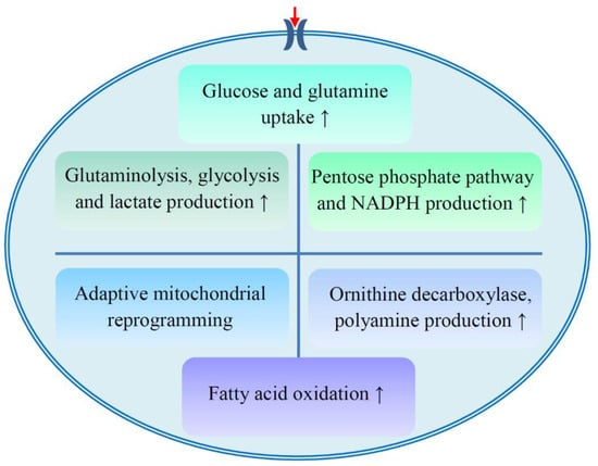 Metabolic reprogramming, metabolic alterations occurring in tumor cells, is one of the hallmarks of tumors [4]. Enhancement of cell proliferation in tumors requires metabolic reprogramming, which leads to the changes of metabolic pathways to generate enough ATP and intermediates for macromolecular biosynthesis under stress to meet the needs of rapid cell division. It is believed that metabolic reprogramming of tumor cells is the consequence of metabolic adaptation, which involves mutations in oncogenes, consequently dysregulating the expression and activity of some metabolic enzymes and the flux of metabolic pathways, and finally affecting whole cellular metabolism. Changes in cellular metabolism not only promote tumor development [5,6,7,8,9], but also contribute to cell resistance to chemotherapeutics [10,11,12,13]. These changes may result from the metabolic adaptation of tumor cells to pharmacological stress, which include adaptations in oxidative stress, lipid metabolism, and bioenergetics; dependence on glucose and glycolysis; and an increase in polyamine production, etc. [14,15,16,17]. Although the underlying mechanism of metabolic adaptation for drug resistant cells has not been well understood, emerging evidences suggest that expression of some metabolic genes or some signal pathways in the drug resistant cells are deregulated [18,19,20]. This leads to an increase in the uptake of glucose and glutamine by drug resistant cells [21,22]; activation of pathways such as glutaminolysis, glycolysis, and fatty acid oxidation [18,23,24]; and promotion of antioxidant production [22,25] as well as metabolic reprogramming in mitochondria [20].
