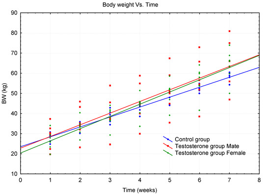Two linear regression models of BW growth versus time were designed to test the anabolic effect, each model especially for the group of treated pigs and the data of the control group (Figure 1). Both models were tested by regression diagnostics. Testing of the regression triplet (data + model + method) showed that the proposed linear models were significant and correct. Estimates of the regression parameters of both linear models are given in Supplementary Materials Table S2. Statistical testing of a comprehensive comparison of both models over the whole-time interval was performed. The Chow test [39] was used to test equality between sets of coefficients in two linear models, using the Fisher-Snedecor distribution with m and r degrees of freedom as statistics. The calculated statistic FCh = 13.583 was greater than the critical value of F0.95(2.62) = 3.150. It could be concluded that the hypothesis H0 was rejected at the significance level α = 0.05 and both models were not equal. Applying the conclusion of the Chow test, it can be concluded that the results of BW growth detected in pigs in relation to the time interval can be considered different for both groups of pigs, e.g., the effect of the anabolic effect of testosterone was demonstrated. Since the initial weights of the two groups of pigs did not differ significantly, it can be stated that in this case the slope of the two linear models compared is statistically significantly different. This partial conclusion of the study is also evident from the graphical comparison of the linear curves of both groups of pigs (see Figure 1). The anabolic effect, but in this case of nandrolone (19-nor 17β-testosterone), a synthetic analogue of testosterone, has recently been similarly demonstrated in treated barrows vs. control barrows [40].