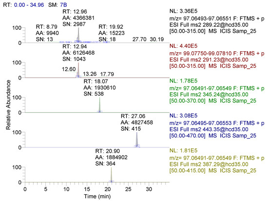 Standards of 17β-testosterone, testosterone propionate, testosterone isocaproate, testosterone decanoate, and 17β-testosterone-D2 internal standard were always identified on the basis of the retention time (see Figure 2) obtained from the chromatogram and mass accuracy (MA) parameters calculated from mass spectra for precursor and product ions of each analyte by comparing the theoretical mass m/z with the measured experimental mass m/z. The obtained results and the calculated MA values determined by the standards are presented in Supplementary Materials Table S3 and in the diagrams showing the detected experimental mass spectra of the analyte standards, always in comparison with the theoretical mass spectra (Supplementary Materials Figures S2 and S3).