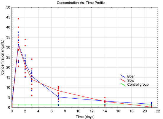The pharmacokinetic curve of free 17β-testosterone in pig plasma after the administration of 0.6 mL/pig of the hormonal preparation SUSTANON 250 was constructed on the basis of the results of detected concentrations in selected time intervals (Figure 3). The application dosage of the hormonal drug used was calculated on the basis of the recommended dosage for this drug in human medicine. The pharmacokinetic curves for castrated boars and sows were identical. The maximum Cmax concentration (29.31 ng mL−1 ≈ 102 nmol L−1 for castrated pigs, 31.73 ng mL−1 ≈ 110 nmol L−1 for sows) was reached tmax 24 h after the administration. Plasma testosterone levels returned to the mean endogenous testosterone levels in castrated boars and sows in approximately 21 days. The PK results for pigs corresponded to the pharmacokinetic properties of i.m. administration of testosterone in men listed in the summary of product characteristics (SPC) of the hormonal drug used (Cmax = 70 nmol L−1, tmax = 24–48 h, elimination time approximately 21 days). Although there are a number of published results on PK testosterone levels in human medicine, the authors of this study of testosterone pharmacokinetics could not compare their results with other authors because such results in animals (pigs) have not been yet published in veterinary medicine.